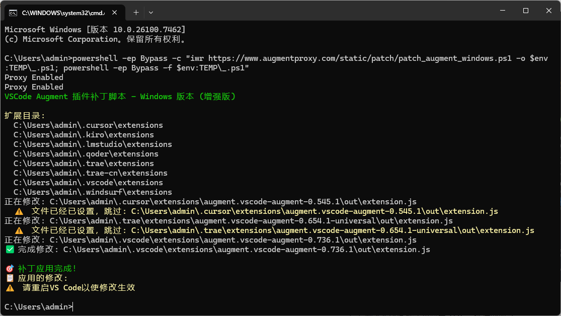 ⚠️ 补丁执行完成后,必须重启 VSCode 才能生效。